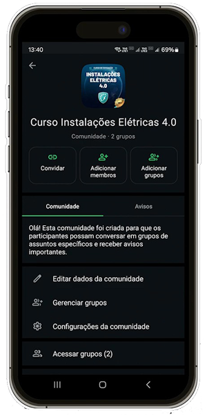 Existe também um Grupo VIP de WhatsApp da Pós-graduação em Instalações Elétricas. Este Grupo tem por objetivo compartilhar experiências e comentários dos participantes do curso entre si, de modo que permitam enriquecer o conhecimento do grupo como um todo e ajudar a esclarecer dúvidas individuais. A participação dos professores neste grupo é facultativa.